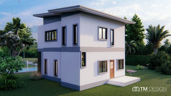 This modern two-storey house design has a total floor area of 120 square meters excluding the parking area. its sleek design conform to the requirements of modern architecture. It is mainly designed with straight lines and geometric forms that convey simplicity.